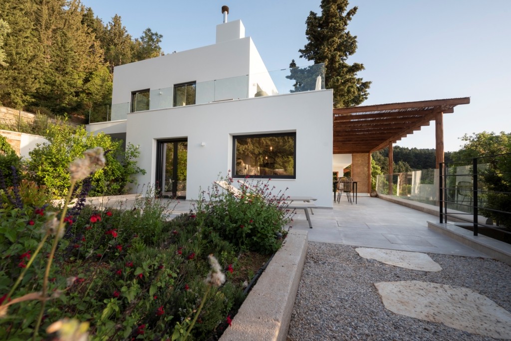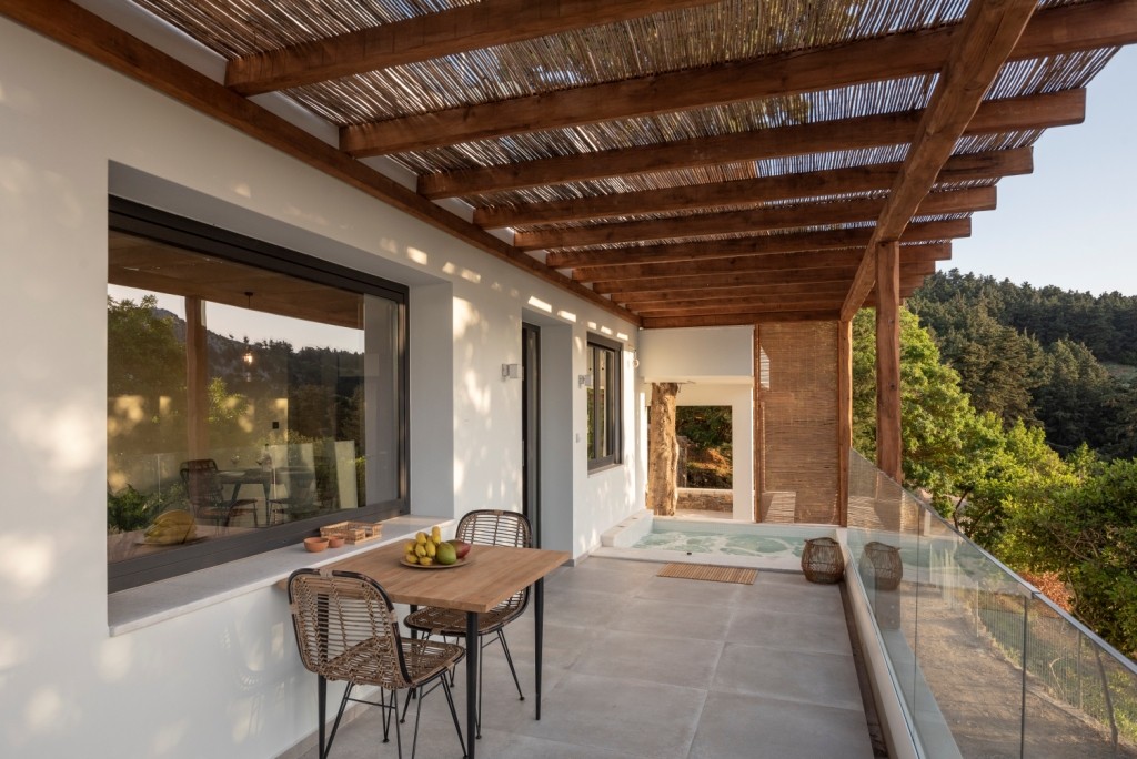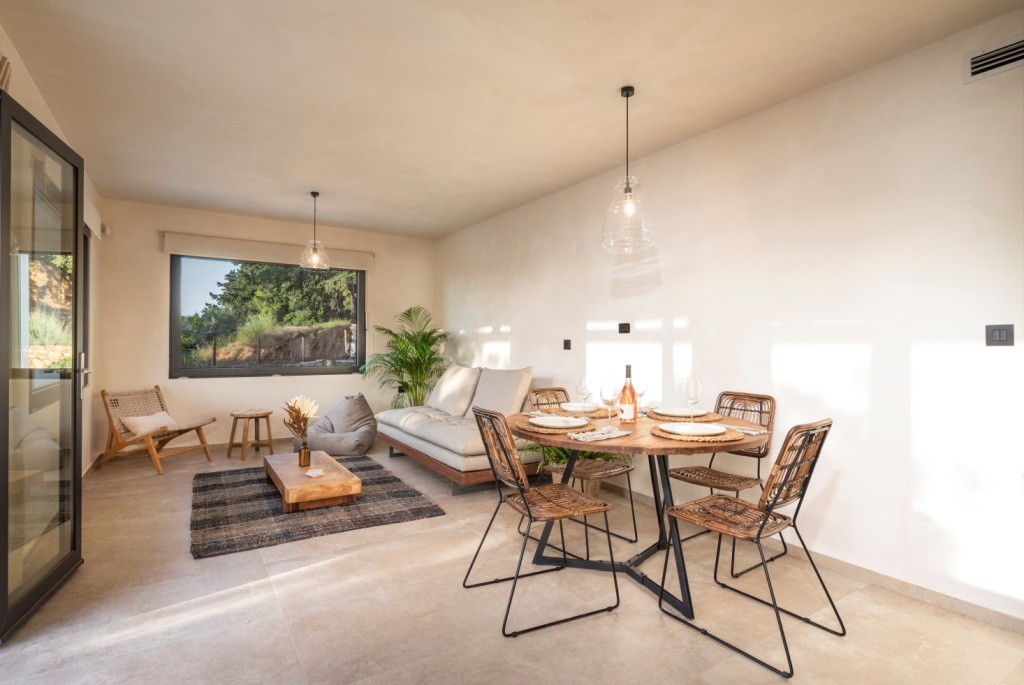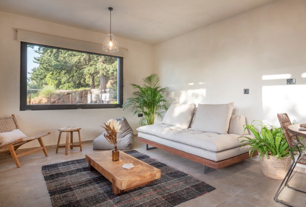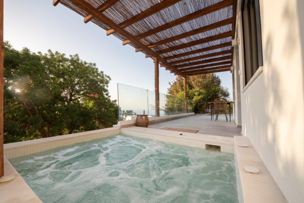 Forest View Villas 2, situated with a sea view, offers a balcony and a coffee maker. This accommodation includes 2 bedrooms, 2 bathrooms with a bathtub or shower and a hot tub, a living area, and a kitchen with a refrigerator, along with towels and bed linens provided. It is located approximately 14 km from the Asklepieion of Kos and offers free private parking.